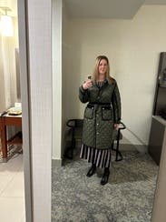 Received compliments whenever I wore! Can cinch waist and arms for more tailored fit. Moderately warm. Wore almost every day I had it!
