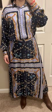 Didn’t end up wearing but cute. Other reviews said they could have sized down so I did. I think the look is just an oversized long shirt. If wearing with the matching skirt I would advise a thicker belt than pictured in mine.