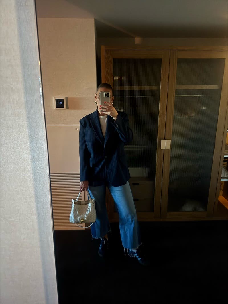 This Maje pinstripe suit lends a classic yet contemporary vibe with its structured blazer and wide-leg trousers. Pair it with a simple tee and loafers for a polished, business-casual look.
