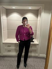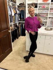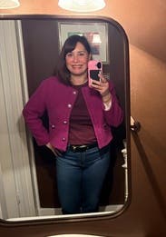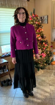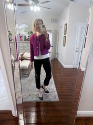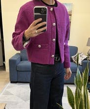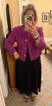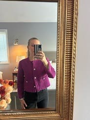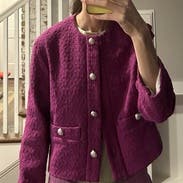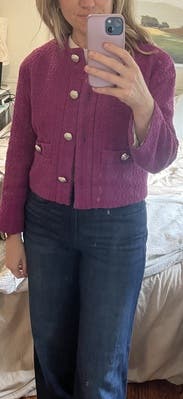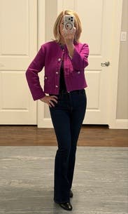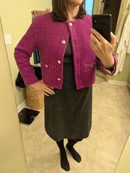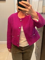 LOVE this, so many compliments at work events. The magenta-pink color pops with a nice fabric pattern. If you are looking for a short jacket that creates positive vibes, this is your piece. The cut is veru comfy and the jacket looks great open and closed with high quality silver buttons. Great cut, fully lined and excellent tailoring make this one of ny all time favorite jackets from RTR