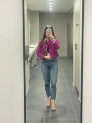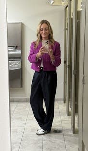 Beautiful color and such a fun pop for work! I got lots of compliments wearing this. It has plenty of room in the shoulders and is comfortable for all-day wear. The sleeves are a bit short, and it definitely has a cropped fit, but that adds to the modern, tailored look. It feels professional and polished without being too stuffy thanks to the bold color. Perfect way to brighten up a work outfit or add some personality to a classic look.