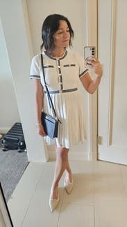 I had to come review this because it is such an amazing dress. Organic cotton French terry - it’s soft and stretchy but reads chic and Chanel. Would be perfect for Wimbledon. While the fabric has stretch, and is free through the hips, the shoulders/waist/bust are very narrow. I’m 32/26/36 and I had to wear a minimizing bra to get the side zipped. If you are at all worried about fit, size up. I think I could have sized up and it would have been fine. This came NWT, and the length was perfect for me- work appropriate but still above the knee. Note that this style of Maje dress usually shrinks up in length after drycleaning. It may be too short for tall people.