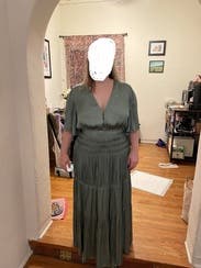 I wore this dress to my son’s baby shower and received so many compliments. In person, the dress was very nice and comfortable. In photographs, the dress looked good about 25% of the time. The sleeves were too flouncy and impeded the body in pictures and the chest area at times looked very booby. I used fashion tape to secure the dress at the neckline and center hooks between my boobs. If I hadn’t used tape, I would have been falling out and on full display. I love the color of this dress, but I’m not happy with how I look in most pictures from that day.
