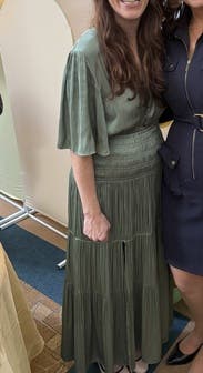 This dress is beautiful and such a comfortable material, but it was too long for me. I also have pretty big boobs and it was not flattering in the chest area.