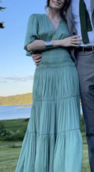 I loved the cut, color, and style of this dress so much! It was very comfortable to wear. Helped hide my mom-tummy and was long without requiring heels (which I was avoiding since this was a backyard wedding). I have two complaints though: 1 the v neck was so low and the hook-and-eye closures didn't stay shut and were visible even if closed. I used a lot of Hollywood tape to make it work. 2 the silk is beautiful but stained so easily. Even condensation from a drink brushing against it left large watermarks for the remainder of the evening (they did not go away as it dried).