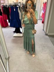 Such a beautiful dress! Color is gorgeous, the silhouette and fabric moves beautifully in person. It’s a lot of dress with a generous fit so I’d size down if you are more petite.