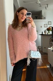 Maje bags have become my go to when I’m renting. They are so good every time. This bag is a little small- just barely fit phone, wallet, lipstick, keys. But this bag is gorgeous and the silver is a fun statement with any outfit.