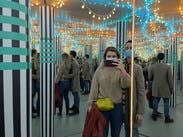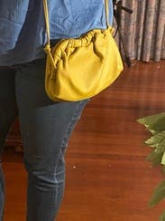 The color was a little more pea green/green-yellow than mustard, but it was nice all in all. Just leather interior, no lining, so this is the type of bag that could easily get scratched up inside over time. Loved the shape and the ruching. Wore it with the strap, but could've worn it without. Cute and pretty versatile.