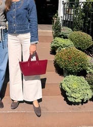 The Mansur Gavriel Red Mini Everyday Tote is a compact, minimalist bag crafted from pebbled Italian leather, offering both durability and a pop of color. Pair it with a white linen dress and tan sandals for a relaxed yet refined look.
