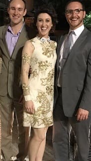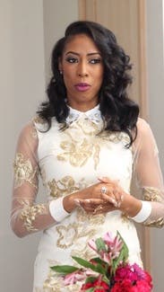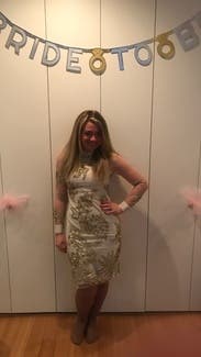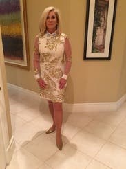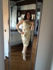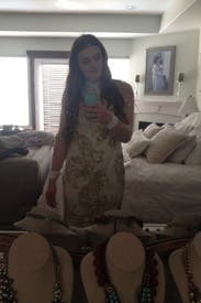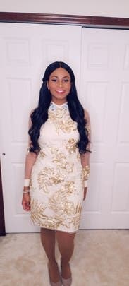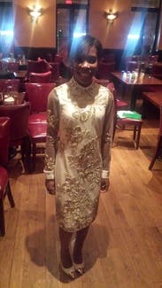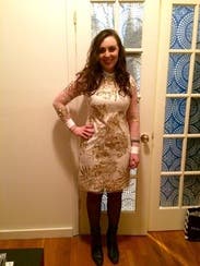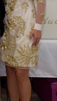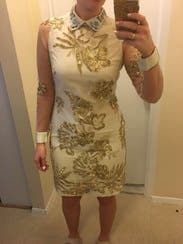 This dress has beautiful gold detailing. Got tons of compliments, but was a little disappointed it looked so wrinkly in pics.