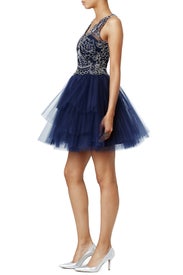 Blue tulle (100% nylon) Sleeveless. V-neckline. Full skirt. Hidden back zipper with hook-and-eye closure. Lined. 35” from shoulder to hemline. Imported.
