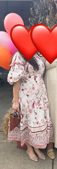 So many compliments- the print and details are very whimsical and delicate with the oversized sleeves adding to the effect. Easy to wear but might be a lot of dress on those more petite. Wore to a high tea at a chic spot and it felt perfect