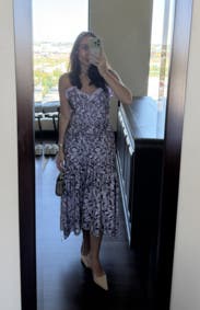 I never wear lavender/purple but gave it a shot with this dress! I loved it. It fit so well and looked better in person than in the photos. The flower details were gorgeous. I’m usually a size 6-8. I wore a size 8 and it was perfect. Didn’t have any stretch but had a nice shape. Straps are not adjustable, could be easily safety pinned if needed. Received so many compliments! Highly recommend