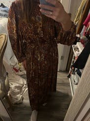 This dress is a heavy layered jersey like fabric Good for cooler weather. Multiple brown hues, paisley floral print. A hint if grey/lavender. It’s super baggy and looks frumpy at the waist. Probably better for someone at least 5’8”. I wore with a grey jacket which hid the frump. Bottom is a balloon style. Huge sleeves. All around baggy style.
