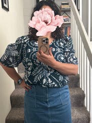 This shirt had so many surprises. The print is lovely in person, had a “tail” at the end of the back zipper to easily zip solo, tailored nicely at the waist and flared out. An overall very flattering top I’ll likely rent again and possibly buy!