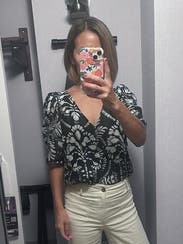 Top is great. Interesting textured fabric, love the print and the puff sleeve. Neckline is lower-pretty different from pics on model. Liked the way it was pictured better with the higher neckline.