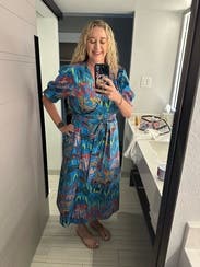 Wore for a bridal shower and found it OK, but I’m partial to Marie Oliver. Classic wrap dress, colors are fabulous. It’s slightly uncomfortable due to the very high quality, thick fabric.