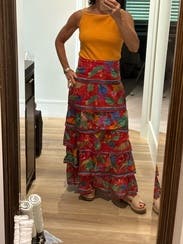 Loved this skirt! It was hard to send it back. Super fun and nice and flowing. Great colors that will go with just about any top. It runs very large, so size down 1-2 sizes. I bounce between 8-10 and could have easily worn a 6.