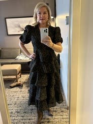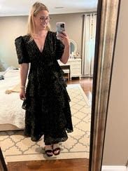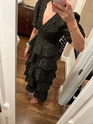 I’m typically an eight or 10, but the six fit perfectly. If you have a bigger bust, only size down one. Despite the ruffles and layers, this dress is remarkably flattering.