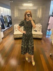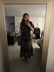 A dress I would never ever buy, but would happily rent, wear, and return. I actually got a couple wears out of this and it was super fun - bold pattern and drop waist! I got a ton of compliments. The material was so comfortable, but size down!! This dress is so stretchy and large, but a great length.