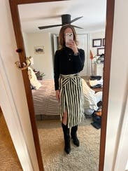 This is a gorgeous piece, it fit perfectly and elevated my look. I'm not really a "skirt" girl, I prefer jeans or dresses, BUT it was beautiful. My only issue, and it's probably user error, but I couldn't tie the skirt well enough to feel comfortable that I wasn't going to accidentally give someone the full monty. So, it gave me a smidge of anxiety. BUT again, it was so beautiful, I'm not even mad at it.
