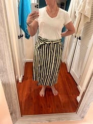 This Marie Oliver skirt features bold, vertical stripes and a flattering tie-waist, creating a chic and modern silhouette. Pair it with a sleek top and strappy heels for a polished ensemble.