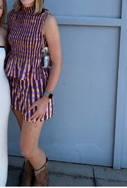This Marie Oliver sleeveless top features a high neck and a playful peplum hem, adorned with a vibrant plaid pattern. It offers a fresh and lively look, ideal for spring or summer outings. Pair it with solid-colored bottoms, like the olive skirt shown, to let the top be the focal point of your outfit.
