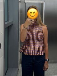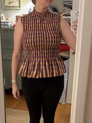 *note- I did get this as a set (top was TTS and bottom was small, see my other reviews to see it with the bottoms) This color combo is so cool and unexpected in person- it comes out as gold, lilac and burgundy (not as bright as I expected) and the bubble tank effect makes it even more unique. All the colors make it so interesting and this silhouette is surprisingly versatile for work, fashion and fun settings. The best part is it works so well with jeans, the matching pants or a short skirt. A total closet/outfit booster I hope I don’t regret not buying this time around- I’m passing as I felt like I wore it enough and the material wasn’t quite soft.