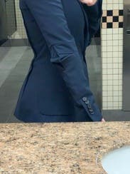 Loved this suit. The blazer fit like it was tailored. The material was on the heavier side and did not stretch. The elbows had an interesting detail to avoid arms feeling too tight.