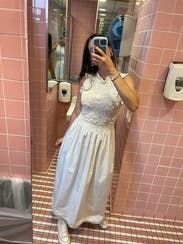 this was a lovely dress, but i couldnt wear it as is, it looked too bridal. i ended up rolling it up into my bra to do the bubble skirt trend. i styled this over jeans for work and everyone lost their minds! people were so obsessed with the fit! i wore it without pants to brunch and a concert and it was very cute. i wore shorts under just to be safe! the fabric was crinkly and almost nylon texture. very weird fabric for the price and it was very see through. i wore a white slip and nude bra.