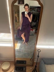 This dress is so fun! It’s a gorgeous plum purple color and has a flattering cut. The drape hangs nicely and the slit with the short (mini) underneath is super flirty and fun. I wore it to a NYE dinner with my husband and it was perfect! I will rent again!