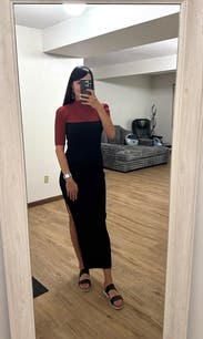 Styled with black tights and booties (no shapewear worn). I enjoyed it overall! I could have sized down but I liked the slightly oversized look and feel. Very comfy! Pros: Warm, modest (styled with tights underneath, the slit wasn’t too high), and chic look overall. The color blocking is really flattering and this is great for larger-chested girls. It’s a great winter dress with tights, not something I would have picked out typically but glad I rented it! I received several compliments at work (corporate office). Cons: A little long (had to hold up going up stairs, recommend heeled boots), the shoulders were large (shown in picture), clung a little bit too my tummy but not too bad!