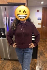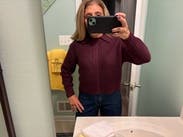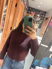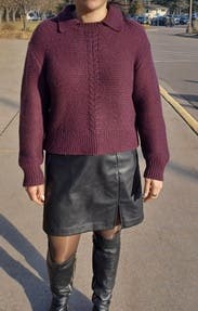 This sweater is a purple/burgundy colored sweater with a collar around the neck line. It is slightly cropped waist length just below the belly button it sets it is soft and not itchy. I gave it four stars because I did not like the way it looked on me. The collar and neck line felt weird to me and I thought it made me look like a young preppy school girl which is the furthest thing from what I am. I do think this Sweater would look nice on somebody else, if they had done the neck line, a little different and the collar a little more dramatic I may have liked it. So sad because it came new with tags.
