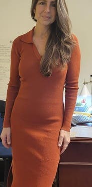 Not a typical sweater material as it has some stretch to it, so I found it didn’t bag out throughout the day like some 100% wool sweater dresses can do. Modest enough side slits. I found the arms to be too long, so I just cuffed it and it worked perfectly. Would rent again!