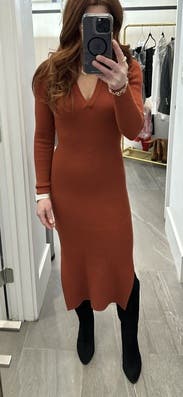 I seem to be on a kick with sweater dresses lately. I love how easy they are for work. This was a great dress. Fit well, not too low cut. I did like the length with my boots. Would rent again.