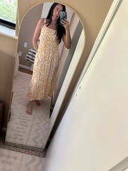 This is an easy, everyday dress. I got a size small and it worked for me in my second trimester, but I definitely plan to wear this even after I’m pregnant so I ended up buying. You can’t go wrong!