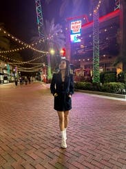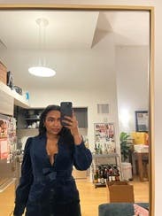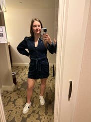 Wore it to a winery, the corduroy material and color make it fun for fall! Shoulder pads add a nice structure