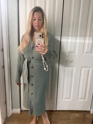 Love how the tie waist defines my hourglass shape. The sage color and ribbed texture are gorgeous. I paired matching teal boots to create a stunning monochrome moment. Does run a little large - recommend sizing down.