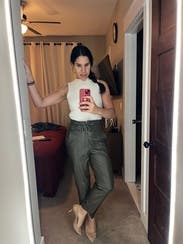 I love these pants and deliberated intensely before deciding to buy the black version since I need more black pants. They're easy to pair with tops and have interesting details like the belt with grommets andd stitching at the knee