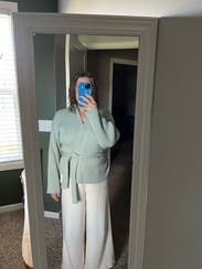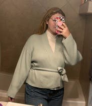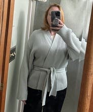 Mint knit (70% Acrylic, 30% Wool). Cardigan. Long sleeves. V-neck. Tie closure. 24" from shoulder to hemline. Imported.