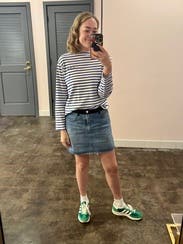 I love this skirt. I’d say it’s true to size but it was a little big in the hips, but it looks big on the model as well, so maybe that’s just the cut. If you are more straight hipped, I’d size down. If you have curves, I’d rent your normal size.