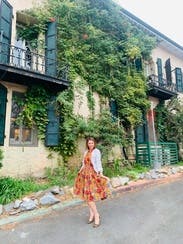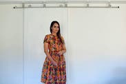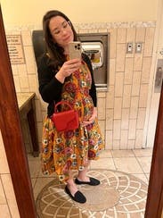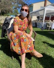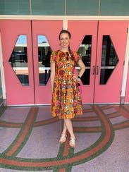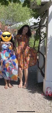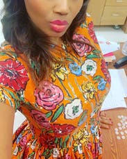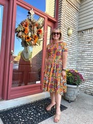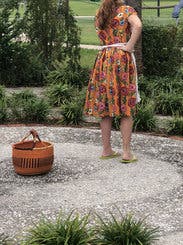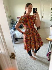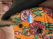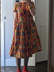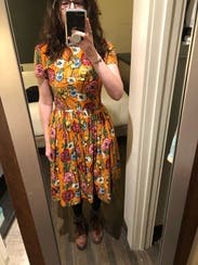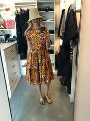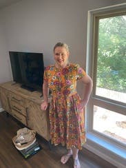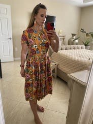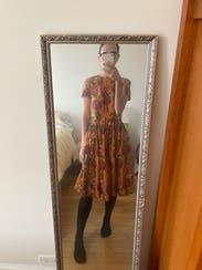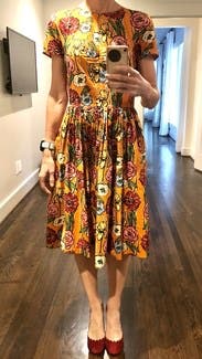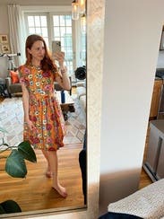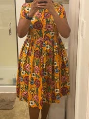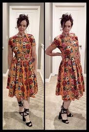 Orange floral printed cotton (100% Cotton). Hourglass. Short sleeves. Crew neckline. Hidden center back zipper closure. 41" from shoulder to hemline. Imported.