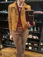 I rented this piece as a single item without the matching skirt and wore it as a jacket over tank tops in 60s-70s weather in London. A very expensive and expensive-looking jacket. Great with dark blue or black jeans. I'm a 36D and was able to button the 42. Perfect fit through arms despite my broad shoulders. The orange color is a hard to match (if you care about that), but I wore it with both a black and cream tank top which picked up colors in the houndstooth pattern. ** A fabric Marni tag was still attached to the left arm by 1 stitch on each corner, so obviously meant to be removed upon purchase, but you can see it in the original listing photos, so I didn't want to take that risk. Gave it a sort of cool military vibe actually, but yeah, it does flash the brand name which is sorta tacky and unnecessary.