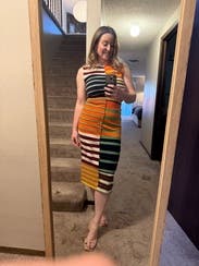 This fit so well! Cozy from the knit fabric and bright with color. A good bit of stretch with this one if you're worried about sizing. It's longer than I thought, which you can't see in the pic, but overall obsessed and received a lot of compliments!