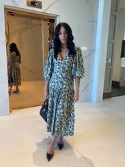 This dress looks so much better than expected once you put it on. The fit is flattering and close to the body. A little lower cut in the chest than I expected. Side zipper was comfortable to get up. The skirt of this dress moves so beautifully and feels great on. Love the muted colors of green and this is perfect for the summer to fall transition but would be just as good for spring. I will probably rent it again. Posted a photo on social and got a call the next day from a friend telling me how great that dress looked.