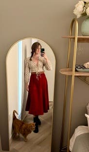 I wore this cute top to an old Wild West themed murder mystery night! Just the right amount of sexy with the deep v neck and cute with the floral and dot pattern to play the soulful flirty (totally innocent) saloon singer. The top is soft and scrunchy. The sleeves do not wrinkle easily which makes it nice to pack too. The sleeves were a tad short but not a dealbreaker for me. It would be a great date night top.