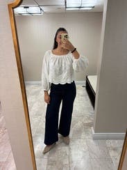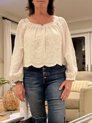 Perfect casual boho top. Love the neckline, length, and flowy arms. Delicate non-peasanty eyelet!
