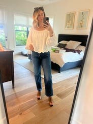 Love this beautiful cream bohemian style top! I wore it with a pair of Madewell wide leg jeans and it looked so cute together! Will 100% rent again. It’s oversized so I stayed with my usual size top of an XS with a 34C and it fit great!