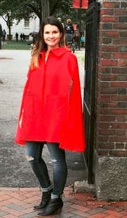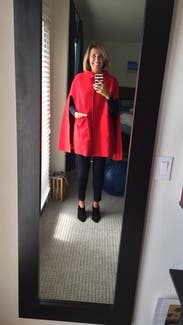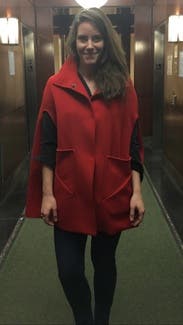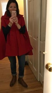 Wore this in the evenings for a ski trip. It's a perfect item to rent because I would never buy a crazy bright red cape, but I had a blast wearing it for the weekend. Runs very large, and you will need a sweater under it because it's basically open to the elements! Super cozy for a long car ride because it's like a big blanket. Will rent again in the fall.