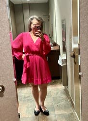 That dress is a winner—vibrant, flattering, and very feminine. The pleated sleeves and skirt give it that soft, flouncy movement that I love, and the wrap belt defines the waist nicely. If the chest is a bit roomy, for me. The bold color works beautifully and the fabric is very comfortable for all-day wear.